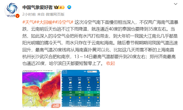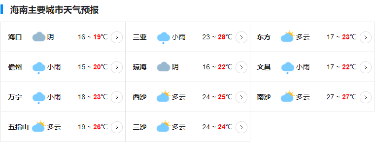 11日~14日,全岛以多云天气为主,其中13日~14日五指山以北地区早晨时段有间歇性大雾天气,海南岛中线高速公路海口至五指山路段、西线高速公路海口至儋州路段、东线高速公路海口至琼海路段早晨有雾,有雾时对交通运输有不利影响,其余时段交通运输气象条件总体良好;各地气温有所回升,最低气温中部地区15~18℃,其余地区18~21℃,最高气温大部地区24~27℃。