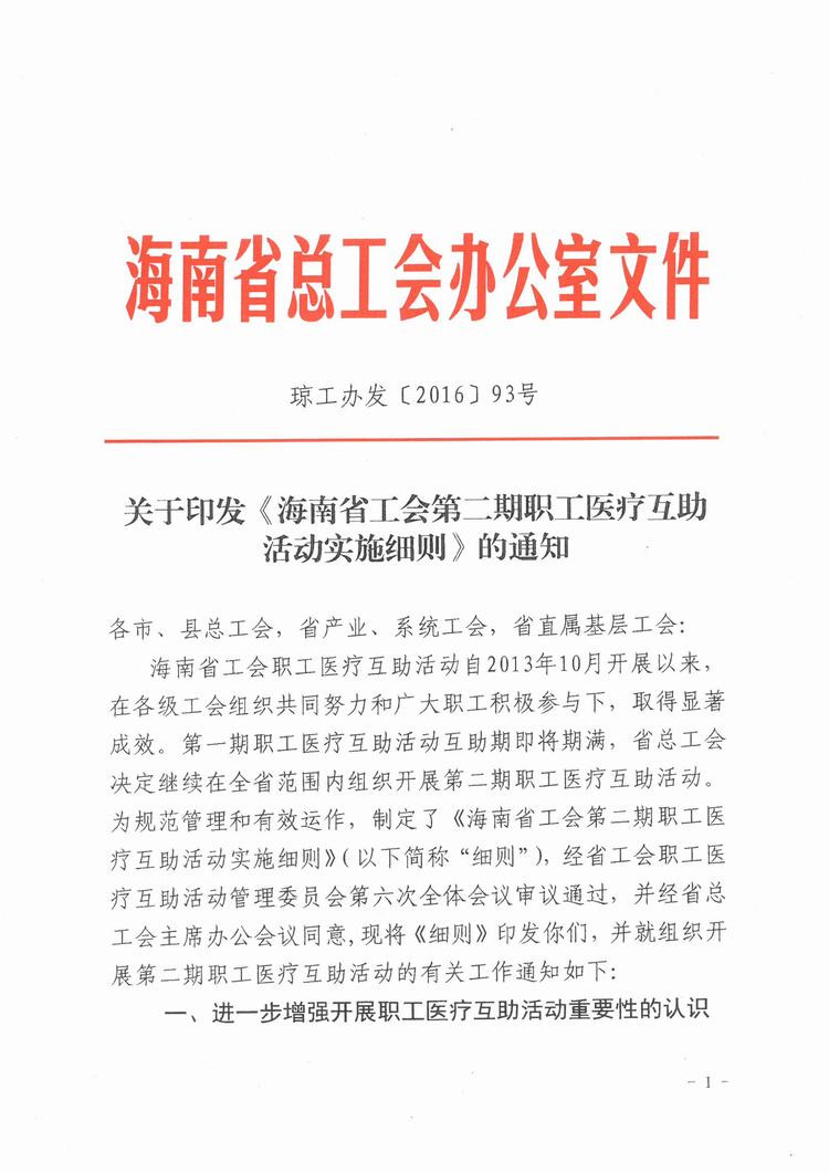 关于印发《海南省工会第二期职工医疗互助活动实施细则》的通知(琼工办发〔2016〕93号)