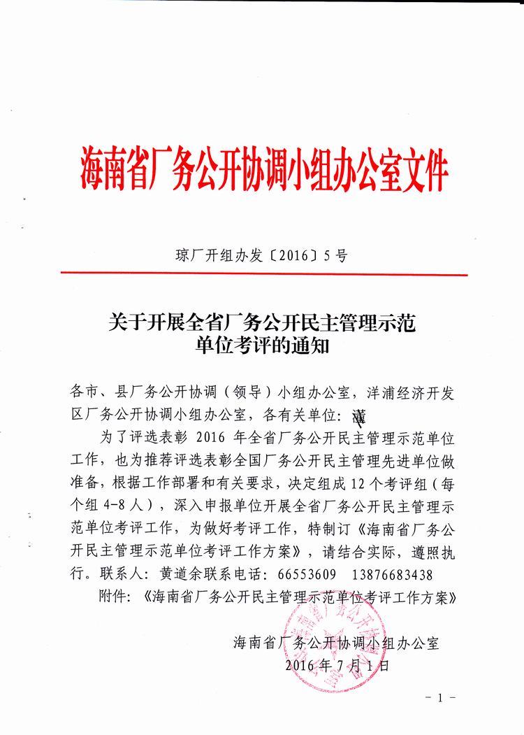 关于开展全省厂务公开民主管理示范单位考评的通知(琼厂开组办发〔2016〕5号)