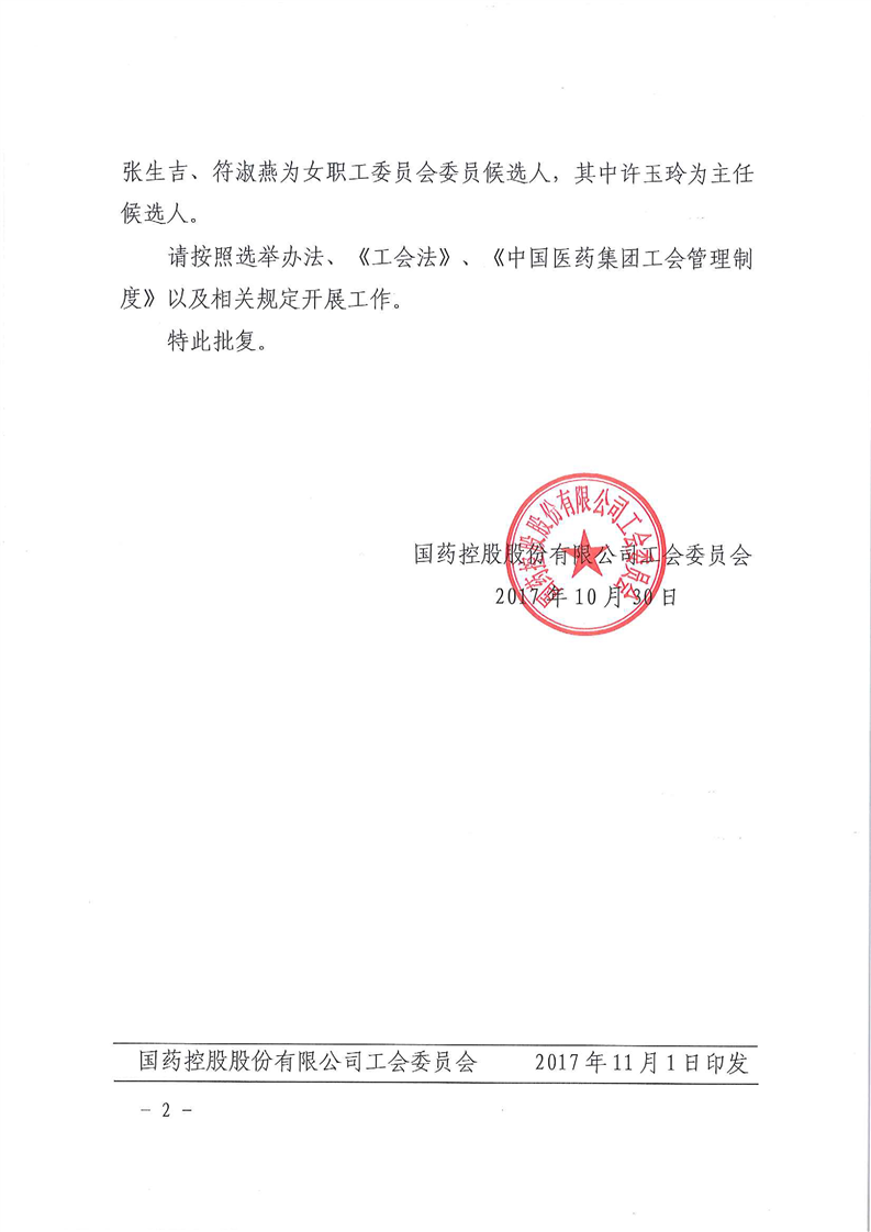 关于同意国药控股海南鸿益有限公司工会第二届委员会、主席候选人的批复(琼工交药工字〔2017〕51号)